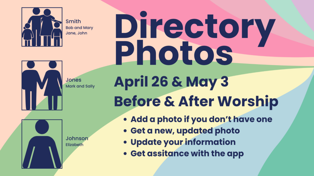 Hopefuls, it’s been a while since we updated directory photos. These photos help us get to know one another. We’re offering the opportunity for photos on April 26 and May 3, before and after worship. Directory photos are associated with your household, so make sure everyone is looking their best and we’ll snap a pic for you! We will also have people available to help you update information or learn how to use the app.