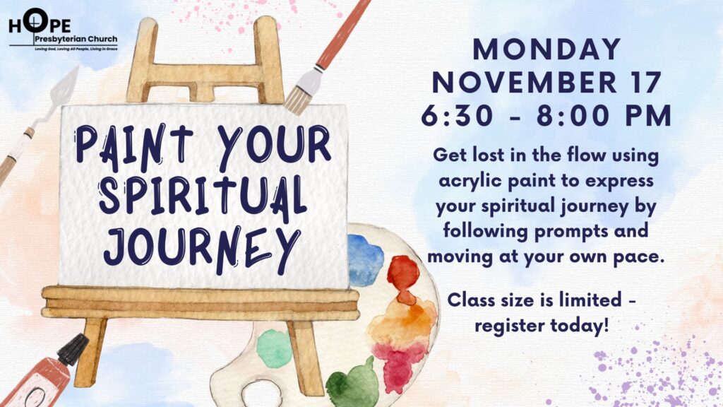 Come get lost in the flow of using acrylic paint to express your spiritual journey. Expect a free-flowing 90-minute experience in a judgment-free zone. We’ll provide all the supplies and some thought-provoking prompts, and then let you move at your own pace. Feel free to bring your earbuds if you’d like your own music. While this is not a learn-to-paint class, no special skills are needed – just a willingness to be creative! If you have any questions, please feel free to contact Laurie, the elder for Adult Faith Formation, at [email protected].