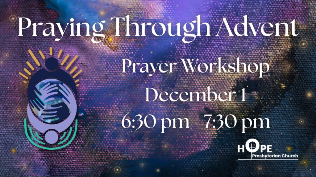 Prayer is a wonderful spiritual practice that can be expressed in many different forms and methods. For some of us, the thought of praying with and for others can be intimidating. How do I pray? What should I say? As we begin the season of Advent, we invite you to attend our prayer workshop, “Praying Through Advent,” on Monday, December 1 at 6:30pm at Hope. During this workshop, our facilitator, Linda Reffert will help us learn and practice praying with someone and inviting us to continue that practice through the season of Advent. This workshop is free and childcare is available if needed. Please register below.